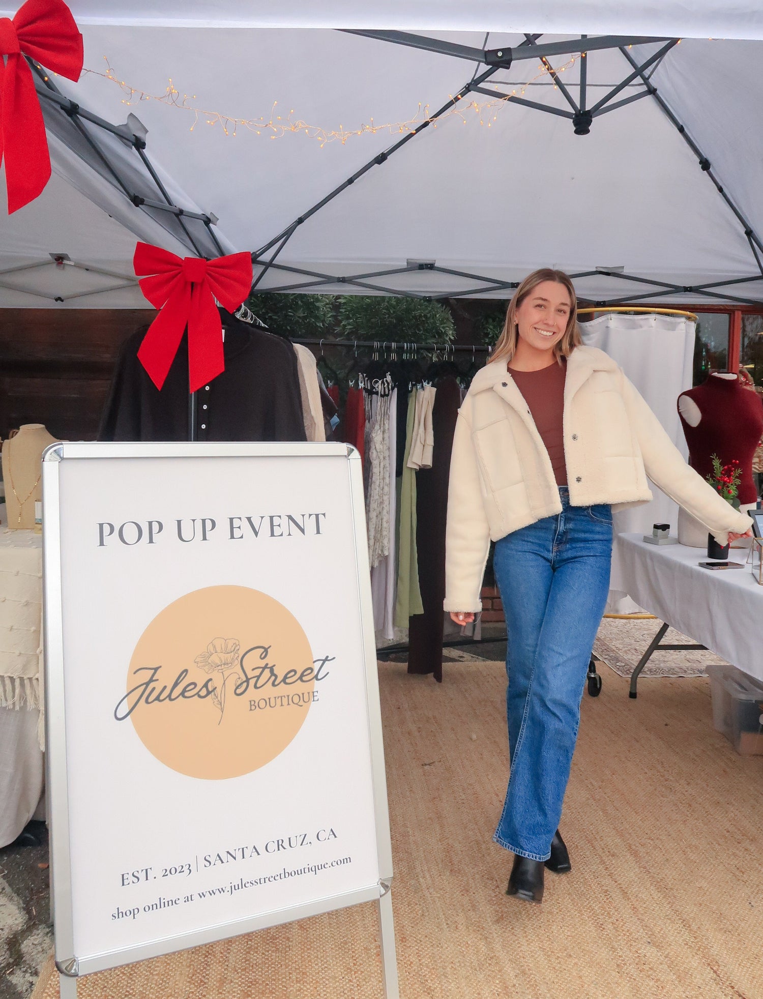 Hi! I’m Julia! The founder of Jules Street Boutique, a 26-year-old boutique owner based in beautiful Santa Cruz, California. What started as pop-up events and an online shop has grown into something I could have only dreamed of—a business that now serves the Santa Cruz and Bay Area communities with curated, thoughtful fashion.