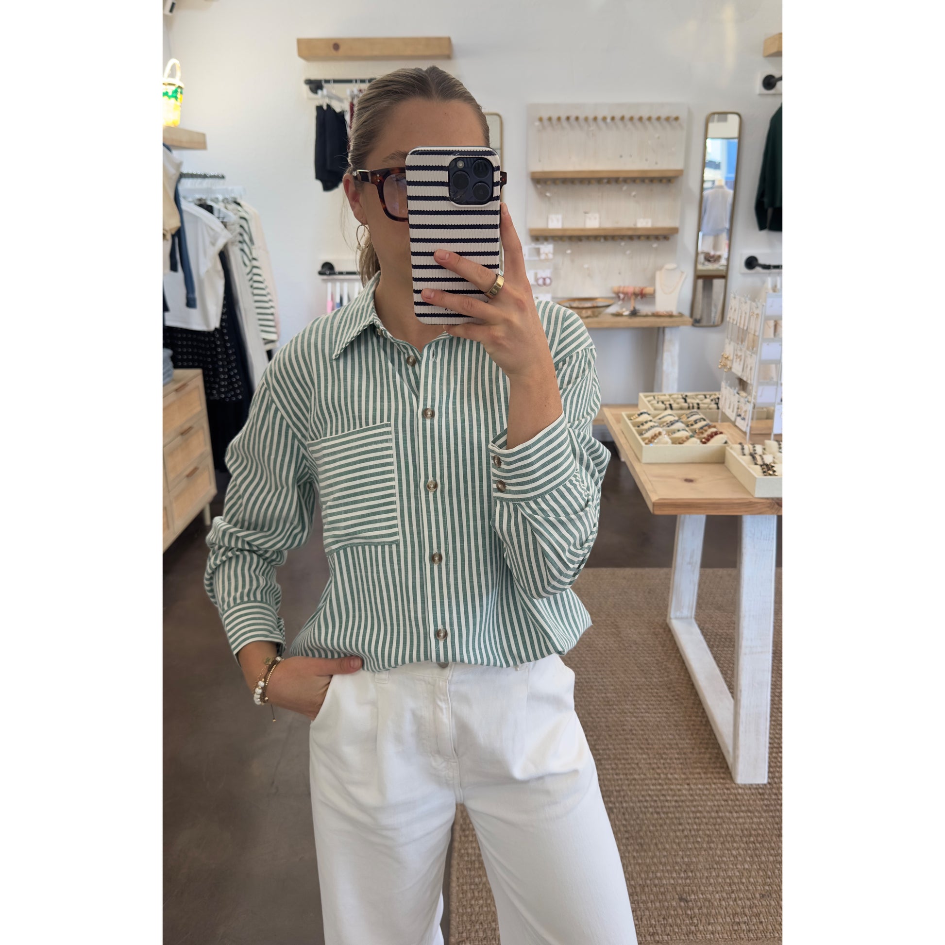 Easygoing and effortlessly cool, this lightweight green striped button-down is your new everyday essential. Made from a breathable fabric, it features a relaxed fit with classic button-front styling. Perfect for layering over tanks, pairing with denim, or tucking into tailored trousers.